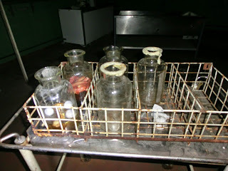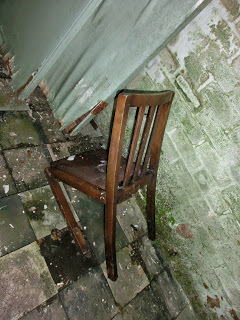 This was a kitchen but was converted at some point.It all felt very badly designed, which I suppose it was. It was never designed to be a hospital so everything they did to the original orphanage would have been a compromise.Shining torches into rooms we weren't going into just yet.An old sheet resting on a pipe.Papers scattered across a desk. Food orders dating back thirty years.In the autopsy room. Emerald green tiles around the wall. Many cracked and broken. The cooker hoods still in place. The other end of the dumb waiter in the corner. A series of metal stairs leading to a boarded up office overlooking the room. A child's broken unicorn toy strewn on the steps.Glass bottles with fake bits of body in them to set the mood.