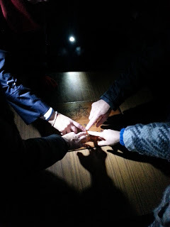 Almost immediately with everyone around the slightly wonky table, there was a vibration. Questions were asked. Come on try and move it more. Thank you for giving us that wobble. Just a bit more.I lifted my fingers off every now and then. Ged started talking to it. We went around the table asking it to reveal itself through the art of rocking a table.I was sure it was Sarah's daughter. I tried to see how much effort it would take to get a good rock on. It was surprisingly easy to get it to rock more--the other's immediately noticed.
