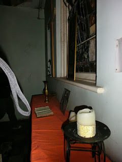 Had to go outside.Ducked through an improvised wooden boarded door.Into a chapel area, and the fridges beyond. Ged crawled into the cremation pit.I took photos.We sat in the chapel around a table to do table tipping.