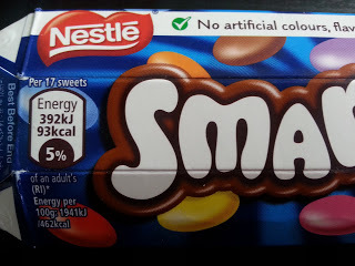 For 17 sweets there is 93kcal. That's 5.47 kcal per sweet.100g is 462kcal. That's 0.22g per 1kcal. So, in the entire 38g tube there are 173kcal.173kcal divided by the 5.47 kcal per sweet gives us 31.6 smarties per tube.