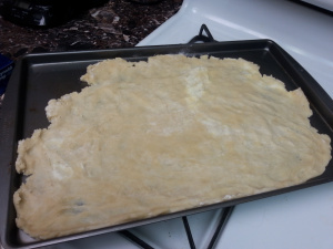 My father used to hand me a small…small ball of dough and a large cookie sheet and I had to stretch the crust with my hands to cover the entire cookie sheet. The original way to make this crust means you have finger prints in it from making it thin and many areas where you can see the pan color below. (It’s a pain to do it this way!!)
