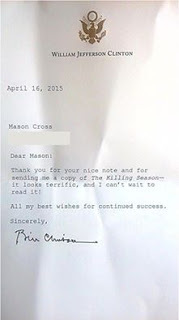 Oh, and I sent a few spare proof copies of Killing Season out to known thriller fans... and Bill Clinton sent me a nice reply.