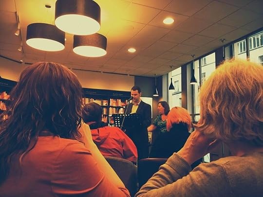 We began with the part I was most nervous about: the reading. Now, you would think that a normal person would find this the least scary part of an event, as you're simply reading words that are in front of you (words that were written by you, even), but hey, I never said I was normal. I have a decent amount of experience in delivering presentations and even taking audience questions in a work context, but I was surprised at how different an experience it is to give a reading. I suppose that's because when you're giving a presentation, it's the information that's important, and you're trying to come across like this is all off the top of your head.