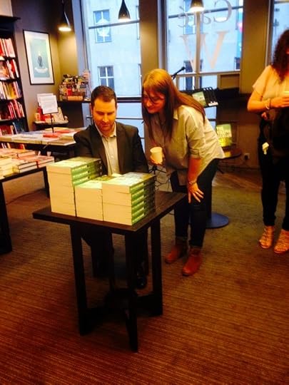 Caron had politely declined to share her planned questions with me, and I'm glad she did. I'd only have prepared detailed answers and proceeded to sound like a robot while reciting them. I was able to answer most questions okay, I think (I ought to be, being the guy who wrote the book and all), and the only ones that stumped me were Who should play Carter Blake in a movie? and, surprisingly, What's the best book you've read in the last year? I read so much that this was a tough one - I can think of lots of standout books I've read over the past twelve months, but picking 'the best' is a tall order. With the luxury of hindsight... I still can't pick one outright winner. Sorry. I'd probably say the top three last year was Stephen King's Joyland, Michael Connelly's Gods of Guilt and Ian Fleming's From Russia, With Love. The last of which doesn't really count as I'd read it before, but this time I really liked it. But I digress. After Caron's expert questioning, we took some questions from the audience. I think these went all right too, and as I'd expected there were questions about my writing process and my influences. There was one tough question from my fellow author Alexandra Sokoloff about whether I'd wanted to say something about America in the book. I didn't have a pat answer for this one, other than that I didn't set out to write a 'message' book, just to tell a good story. That said, I think the story does end up saying something about America, and the modern world in general, in the way the politics of fear drive the plot and some of the characters. And after some great questions, we were onto the really fun part: the signing.