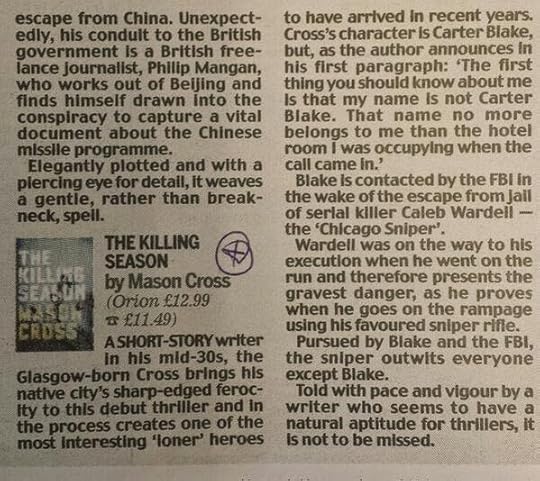 There’s lots to admire in Cross’s thriller. The writing is assured and entertaining. Mr. Cross really knows his way around a set-piece, and they come thick and fast. The plotting is slick and pacey. As the FBI caravan zigzags from state to state in pursuit of Wardell, Cross manoeuvres his characters inexorably towards a satisfying fatal showdown ... in his debut novel, Mason Cross has really hit the ground running, there’s no doubt about that. The Killing Season delivers time and again with smart big-screen thrills."