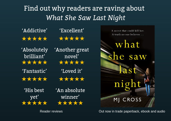 What She Saw Last Night, my first ever standalone thriller after five books in the Carter Blake series, is published in the UK today.