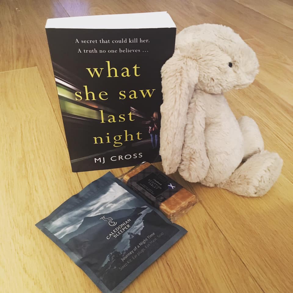 A signed copy of What She Saw Last NightA genuine Caledonian Sleeper sleep kit, containing ear plugs, eye mask and soapA bar of Scottish tableta bunny