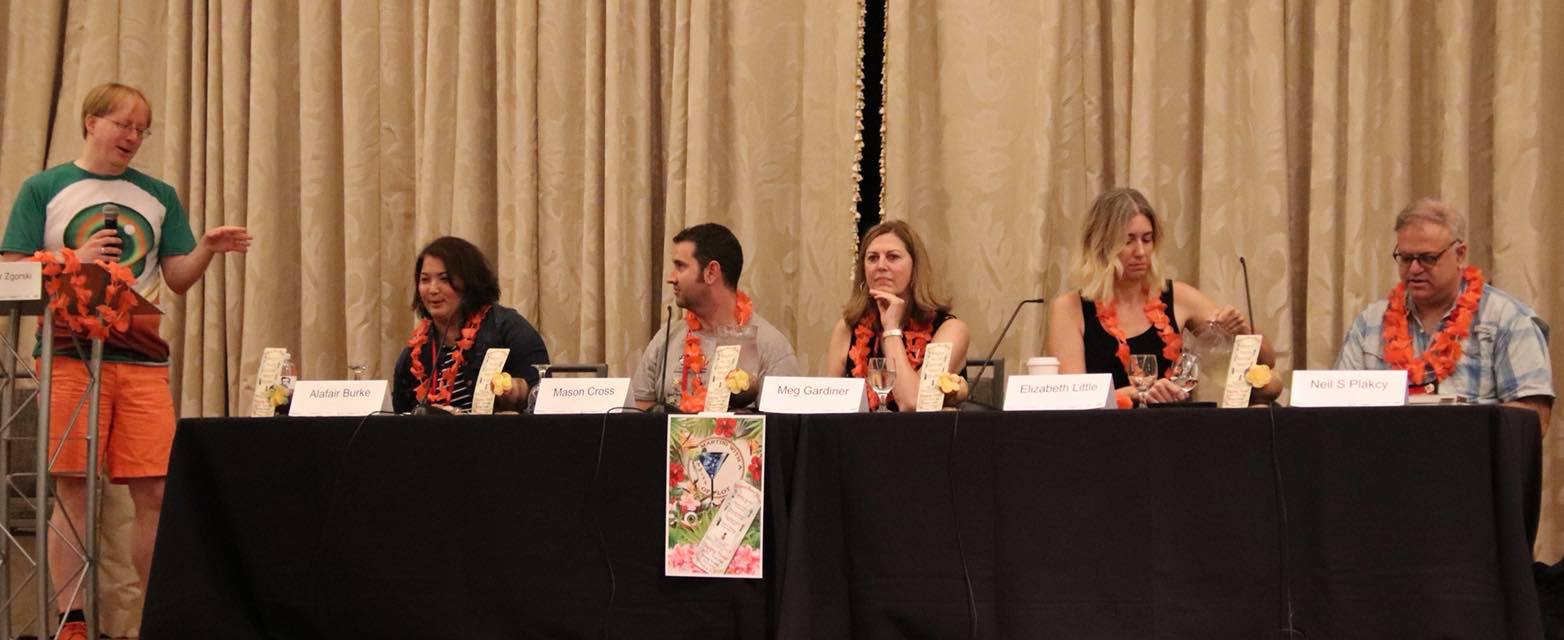 After lunch at a British pub (I know) with some fellow authors, I headed into my first panel: Martini with a Twist of Plot. It was a great lineup: Alafair Burke, Meg Gardiner, Jennifer Hillier and Neil S Plakcy, ably hosted by Kristopher Zgorski. We discussed serial killers, techniques for building tension and lots more. We also got leis (the flowery necklace things) and coconuts, making this easily the best-accessorised panel I've ever done.