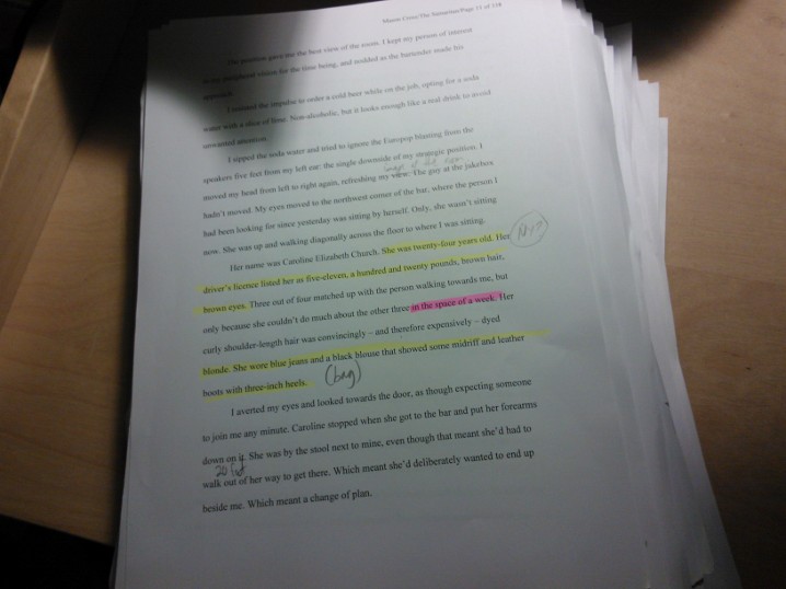 Ideally, I take a break for a few weeks and come back to it fresh, but the available time doesn’t always allow that. When I come back to the draft the first thing I do is print it out and go through with a pencil and a notebook and lots of different coloured highlighters working out everything that needs to be fixed. There’s always a lot that needs fixed.
