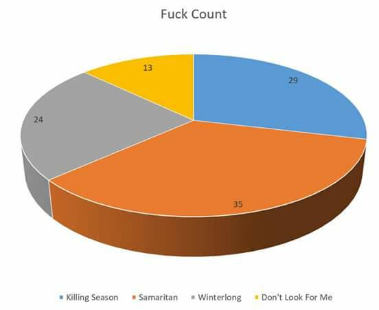 I wondered about the reasons for this. Perhaps I'm subconsciously toning myself down in hopes of appealing to a broader market. Or perhaps the fuck-count is related to the type of story I'm telling. The Killing Season and The Samaritan both feature law enforcement officers as major characters, which probably leads to an increase in salty language.