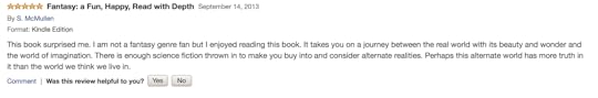 This book surprised me. I am not a fantasy genre fan but I enjoyed reading this book. It takes you on a journey between the real world with its beauty and wonder and the world of imagination. There is enough science fiction thrown in to make you buy into and consider alternate realities. Perhaps this alternate world has more truth in it than the world we think we live in.
