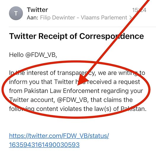 ‘Graag willen we u, in het belang v/d transparantie, op de hoogte stellen dat @twitter een verzoek heeft ontvangen van de Pakistaanse justitie/politie ivm uw twitteraccount @FDW_VB waarom gesteld wordt dat de tekst v/d tweet een overtreding inhoudt v/d Pakistaanse wetgeving.’