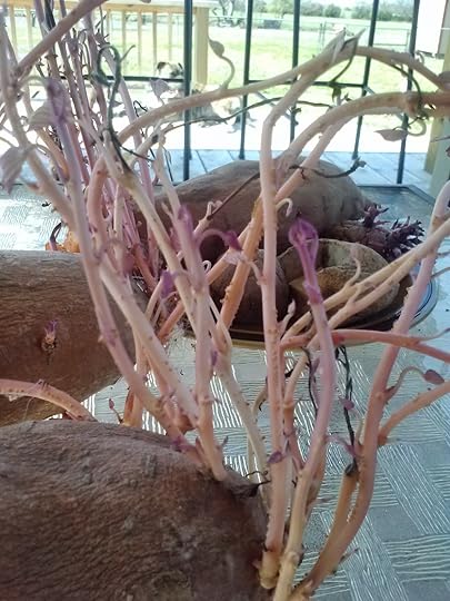 Lotte fought an SUV.That led to a round of rousing puns and muscle relaxers for a few days. It also kept me from wanting to sit down at a keyboard and write. Laptop=tiny T-Rex arms. So I puttered around the house and finally pulled my sweet potatoes from the pantry. Yes, they've been in there a while. Yes, it was completely intentional. This time, anyway.