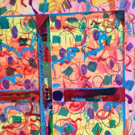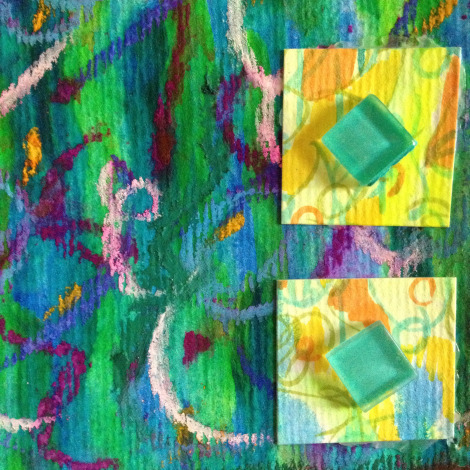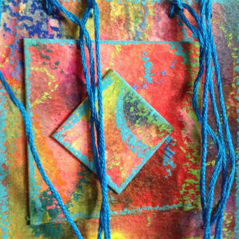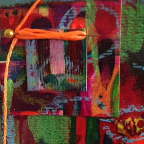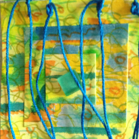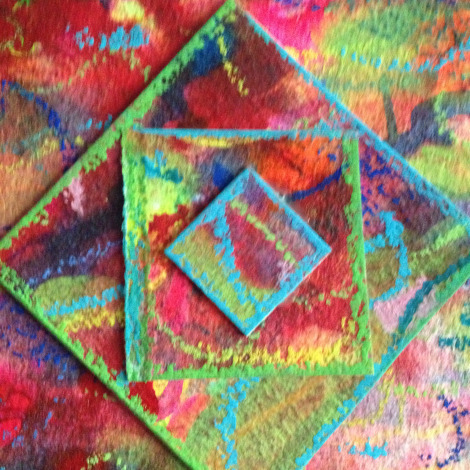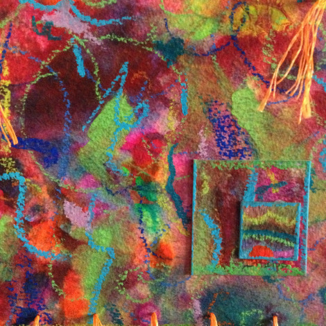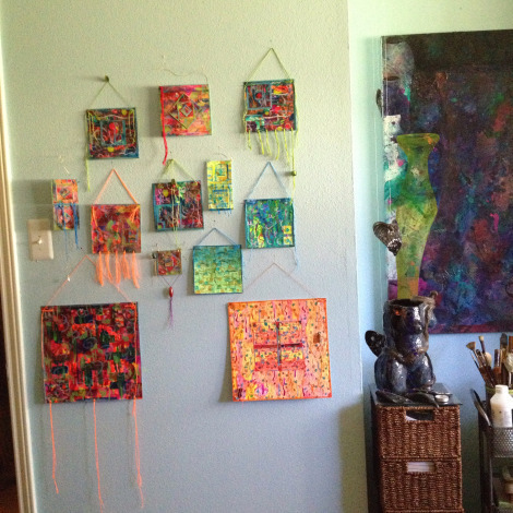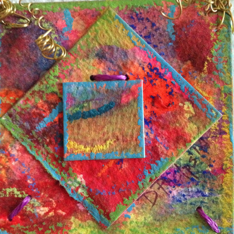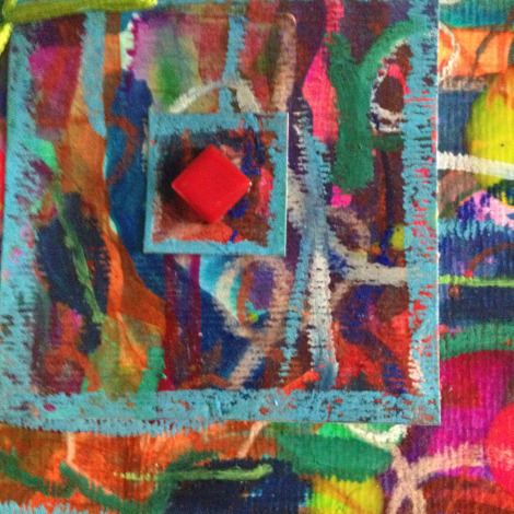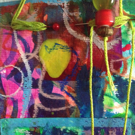 3×3, 6×6, & 12×12″ mixed media collage with repurposed beads, threads, wire & pins.