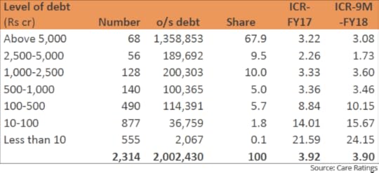 The companies with a debt of Rs 2,500-5,000 crore are in the worst possible space. The interest coverage has fallen from 2.26 for 2016-2017 and to 1.73 during the period April to December 2017, respectively. Clearly the positon of these companies on their ability to keep paying interest on their debt has come down.