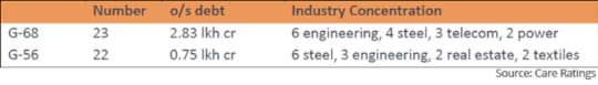There are 56 companies in this bracket. Of these 22 companies have an interest coverage ratio of less than one. These companies have a total debt of around Rs 75,000 crore. These companies (along with large companies with an interest coverage ratio of less than one) primarily operate in the steel, engineering and textiles sector. Take a look at Table 2.