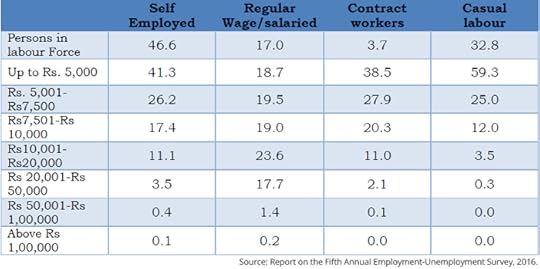 Table 2 shows us the income levels of India’s workforce. As far as the self-employed and the contract workers are concerned, nearly two-thirds of them make up to Rs 7,500 per month or Rs 90,000 per year. In case of contract workers, more than 84% of contract workers earn up to Rs 7,500 per month or Rs 90,000 per year.