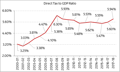 What does Figure 1 tell us? It tells us that the direct tax to GDP ratio in 2017-2018 is likely to be at 5.94%. We use the word likely because right now what we have is a GDP estimate for 2017-2018, which will change when the actual numbers come out, later this year.
