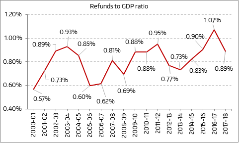 The refunds have fallen from 1.07% of the GDP in 2016-2017, to 0.89% of the GDP in 2017-2018. This is the second biggest fall in refunds between 2000-2001 and 2017-2018. It will be interesting to see what portion of the returns filed still remain to be processed. The larger point being that the direct tax collections data does not pass this basic smell test.