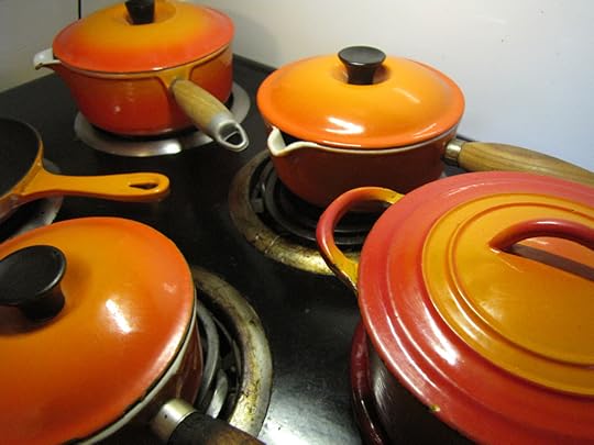 It took some doing, but in almost exactly three years, I’ve managed to acquire a relatively complete set of Flame color Le Creuset pans at the local Goodwill. (Not to mention a red LC stock pot, a red LC utensil crock, a big new oval red Dutch oven by another brand which looks like a Le Creuset, a matching trivet, many cast iron skillets, and a ton of cool stuff that has nothing to do with my kitchen.)