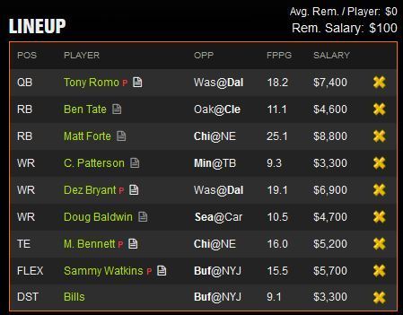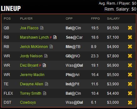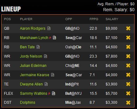 I see the Packers putting up a ton of points and the Dolphins needing to play some catch up. Hartline is averaging over 6 targets a game and a due for a solid game. The game where there will be a lot more targets to go around is a good bet for a solid game from him. With his low salary I was able to throw in my 2 top tier wide outs as well as Aaron Rodgers, if he can throw in a decent stat line to go with it I would be more than satisfied with this pick.