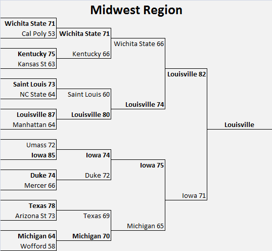 Go back and read the intro to that post if you want to know the details on the model. But now, let’s take a look at the updated projections for the Sweet 16 and on.