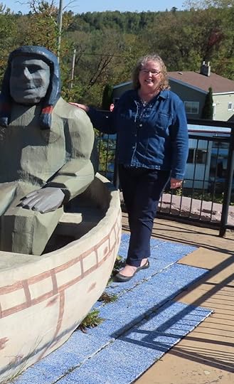 Karen and the statue of Paddle and his canoe in Paddle-to-the-Sea Park, Nipigon, Ontario