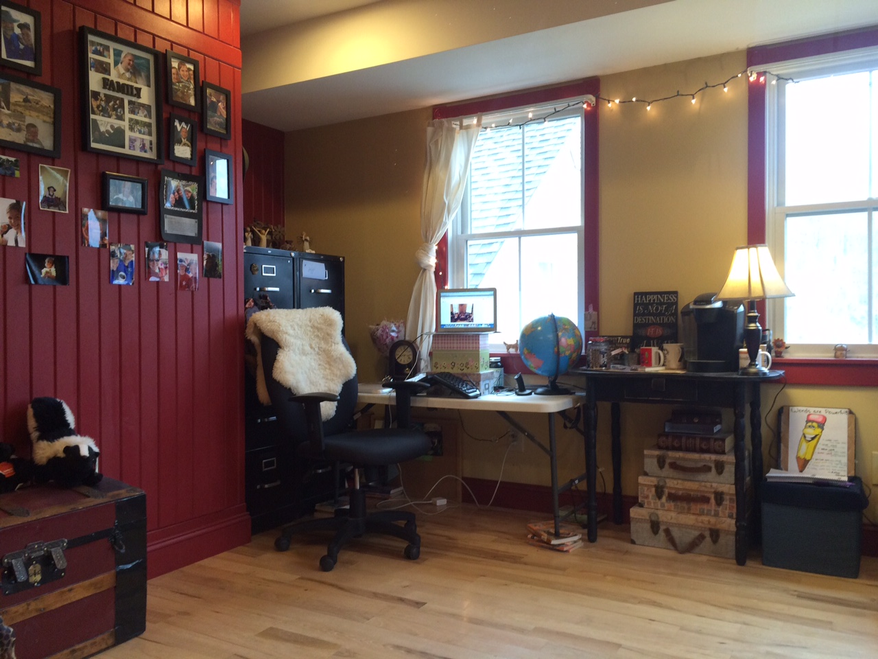 My new office was a bit more spacious, although not in the loft of an old barn. Since I enjoyed my previous office so much, I modeled my new writing corner in almost the same exact way. (Note the stuffed animals in the right corner. Stuffed animals do wonders for the imagination.)