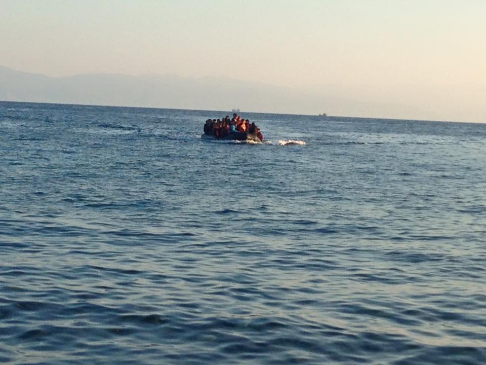 {When the people arrive} we guide them to a safe place to dock and form a human chain to help them up the steep bank. On this raft there were about 50 people. Multiple families with a total of 26 children, 18 of which are under 2 years old. I have the privilege of getting my feet wet and being at the raft taking their outstretched hands and helping them to safety. Babies are passed to me and I hold them close, try to quiet those that cry and smile at ones that don't have a care in the world. One little boy, no older than 2, is handed to me and cries in fear as I hold him while his mother gets out of the raft. He is terrified and his eyes seem full of fear. I wonder what all he has experienced in his short life. (From B.)