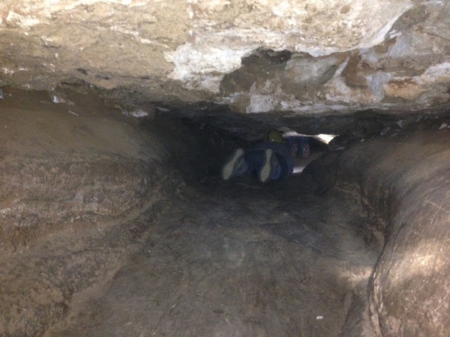 This is a picture (below) of Andrea coming out of one of the belly crawling places. I'm not good with distances, but I'm guessing this was about fifteen feet long. And it's not a straight stretch, either. To get through it you have to twist and turn and wiggle around rocks and use your feet to propel you forward. Plus, you're going slightly uphill so you can't see the end of the crawl space. It's a little bit freaky.