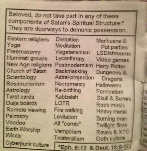 Christian pamphlet lists LSD, cyperpunk culture, vegetarianism, Burning Man, heavy metal, and dozens more as ‘doorways to demonic possession’ (Found at Stuff Fundies Like)