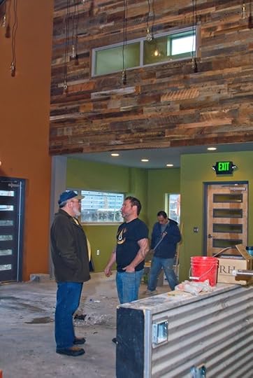 Gabe and I in the future Tasting Room at the front of the building. Note the reclaimed wood walls.