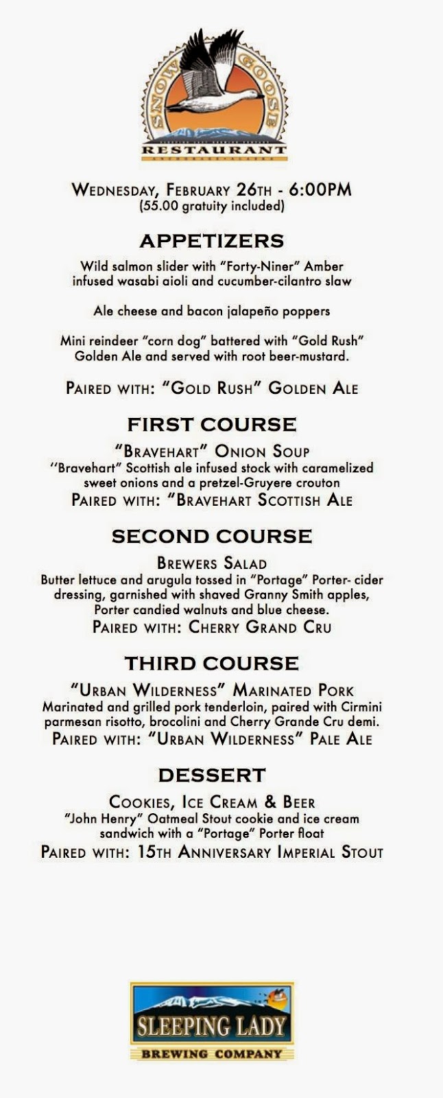 Last time round I also wrote about the Talkeetna Beer Trippin' that the Great Northern Brewers will be holding the same weekend as the Beer and Swine Festival. The menu for the Beer Dinner at Twister Creek on Friday, April 4th has now been released. Here it is: