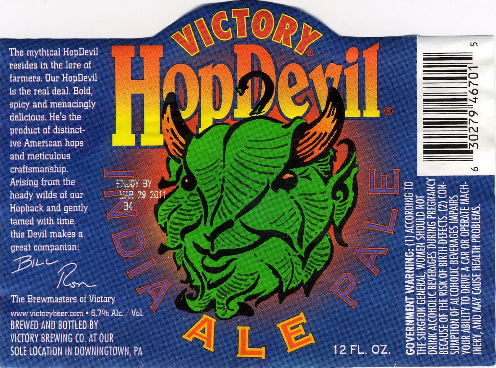 Victory Brewing's HopDevil IPA: One of the classic East Coast IPAs out there. Poured the classic copper color with a big off-white head and a nice aroma of American hops. Good lacing on the glass. Nice lingering bitterness, plenty of good clean hop flavors, but more restrained than its West Coast cousins. Very drinkable and an excellent IPA. 6.7% ABV.