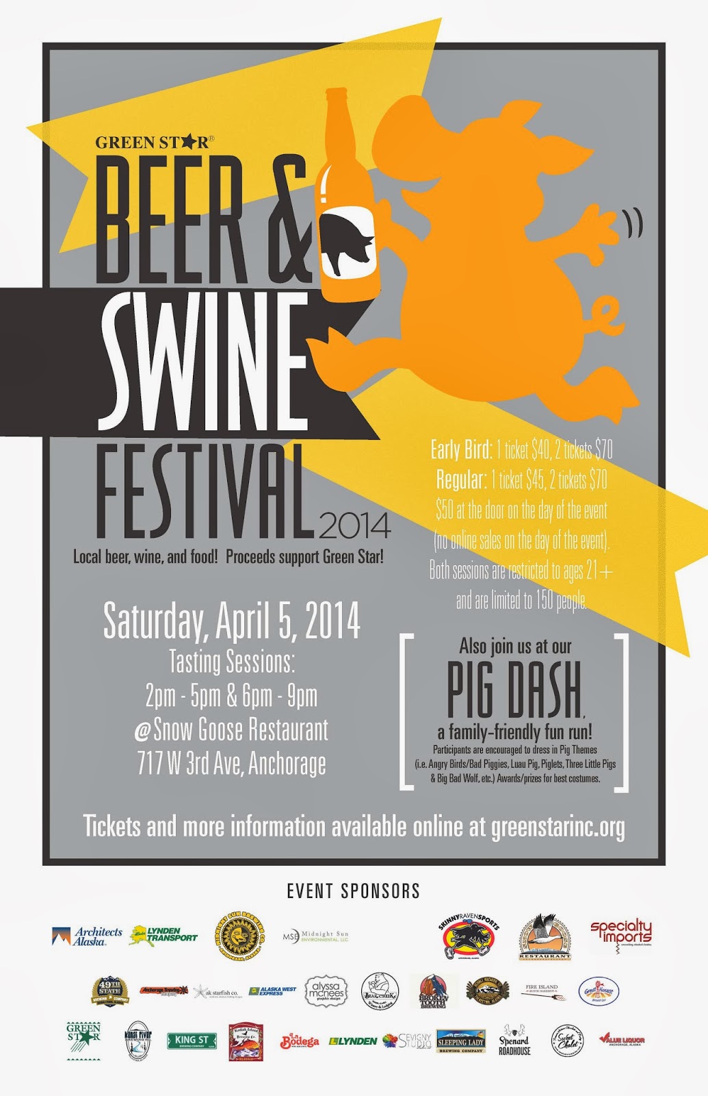 Speaking of events, Green Star's Beer & Swine Fest will be taking place at the Snow Goose in Anchorage on Saturday, April 5th. There will be two tasting sessions, one from 2 to 5 pm, and one from 6 to 9 pm. Each session will be limited to 150 tickets, which will go on sale at the Green Star website on Tuesday, March 4. Look for beverages from Midnight Sun, Bear Creek Winery, Odom Corp., Specialty Imports, Anchorage Brewing, Kenai River Brewing, Sleeping Lady Brewing, and 49th State Brewing, along with appetizers from various restaurants and a silent auction. Here's the flier for it:
