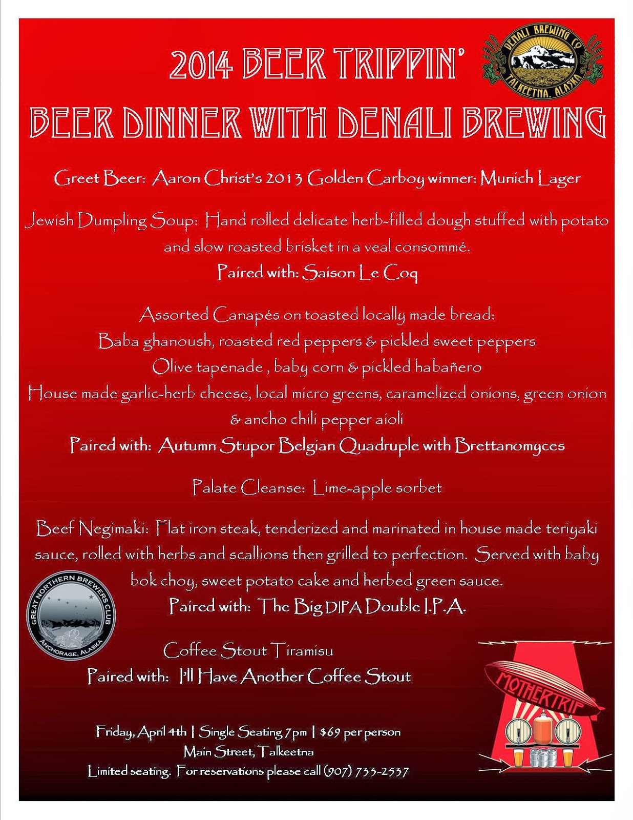 Click to EnlargeLast time round I also wrote about the Talkeetna Beer Trippin' that the Great Northern Brewers will be holding the same weekend as the Beer and Swine Festival. The menu for the Beer Dinner at Twister Creek on Friday, April 4th has now been released. Here it is: