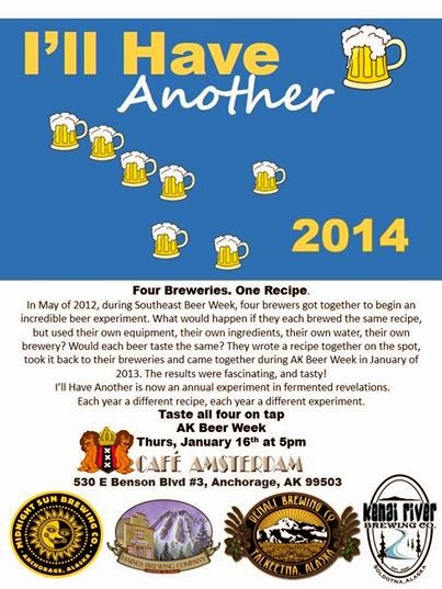 Thurs, Jan 16: "I'll Have Another" collaboration release party at Café Amsterdam. Coffee Stout. Breweries: Denali Brewing, Midnight Sun, Kenai River Brewing, Haines Brewing