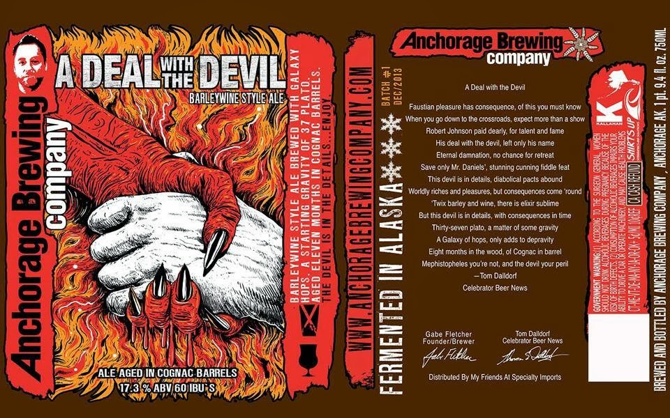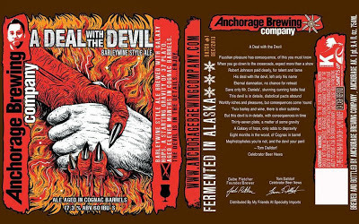 Gabe Fletcher of Anchorage Brewing Company has announced that he will be bottling this year's version of his amazing and award-winning barley wine, A Deal with the Devil. This 17.3% monster took first place in the barley wine competition at the last GABBF. See my review of it on 1/25/2013. The amount available will be extremely limited, but I will definitely be snapping up all I can. Oh, and the label is totally kick-ASS:
