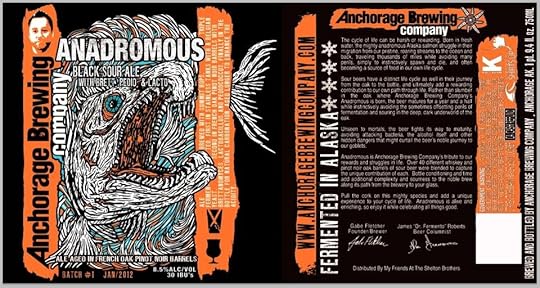 (Thanks, Pamela!). The first one I tried was Anadromous Black Sour Ale, 8.5% ABV and 30 IBUs, which was brewed with brettanomyces, pedioccocus, and lactobacillus. It was then aged in over 40 French pinot noir wine barrels before being blended and bottle-conditioned. The beer poured opaque with a small tan head. The aroma is rich and slightly tart, with a touch of dark fruit; no brett funkiness, at least at this stage, but some oak elements present. Not super sour at first taste, pleasant tartness and more oak, with medium mouthfeel and moderate carbonation. It defintely reminded me of another beer. It took a few moments to pull it from the old memory bank, but then I had it: Midnight Sun's Cafe Amsterdam 10th Anniversary Dark Strong Gruit. I first reviewed that hop-less brew on 5/18/2009, then again on 6/1/2010, at which point it had soured considerably. Anadromous reminded me of that aged, more-soured version. So the next question is this: what will several months in the cellar do to its flavor profile? I'll let you know.