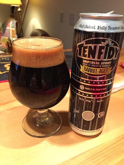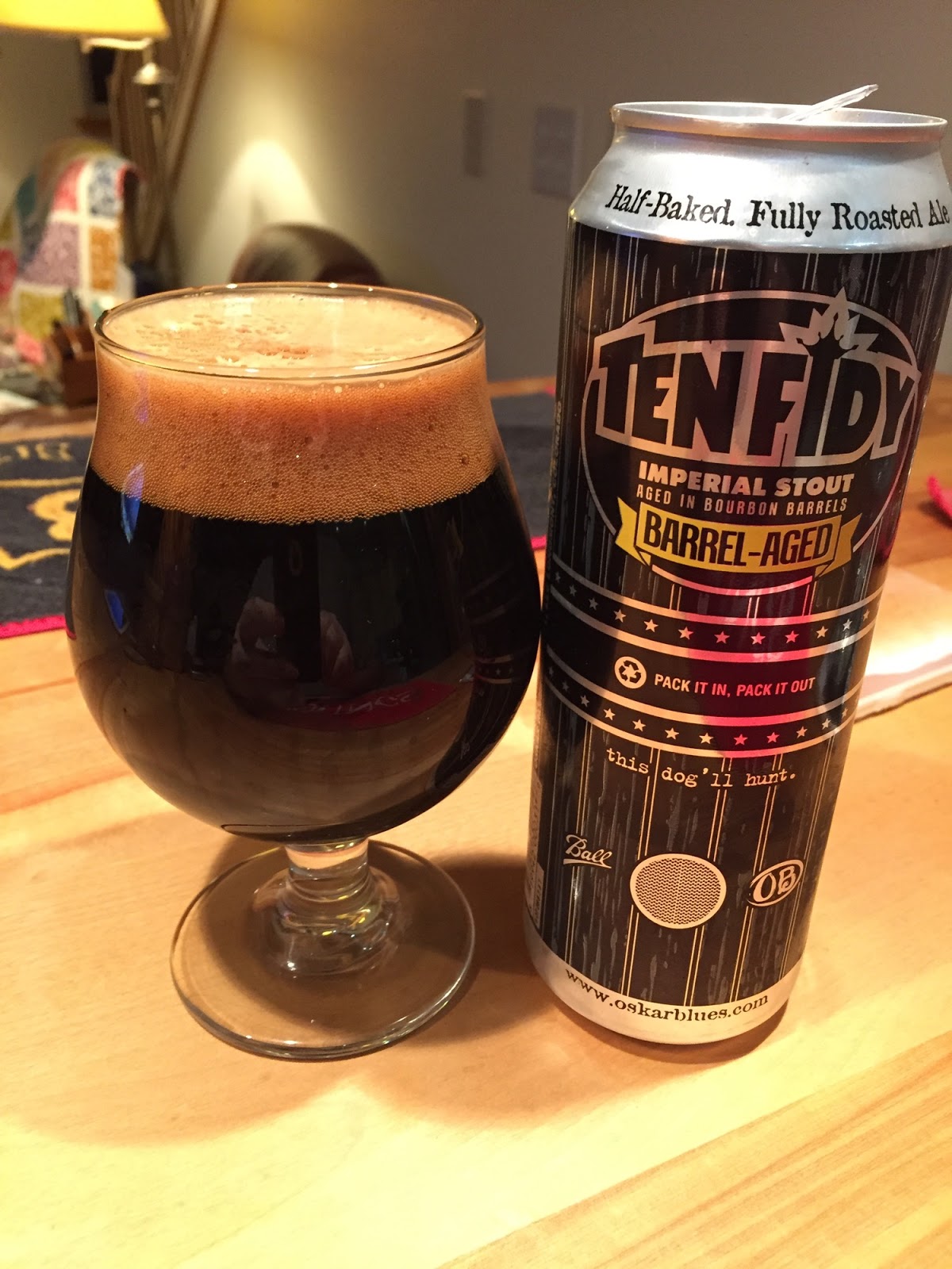 Oskar Blues Brewing's Barrel-aged Ten Fiddy Imperial Stout: The holidays are the perfect time for big beers, so let's keep those barrel-aged imperial stouts rolling. This is a bourbon-barrel-aged version of Oskar Blues' classic beer, packaged in a 16 oz. tall boy can. It poured opaque with a big tan head. The aroma had both roasted notes from the stout and bourbon and oak notes from the barrel. Carbonation was good and the mouthfeel was heavy and chewy. The bourbon came on strong up front, then the chocolate and coffee notes from the stout stepped in. The finish was long, with some alcohol warmth. Excellent job of adding another element to an already classic beer. 12.9% ABV, 98 IBUs.