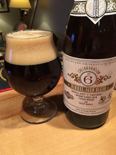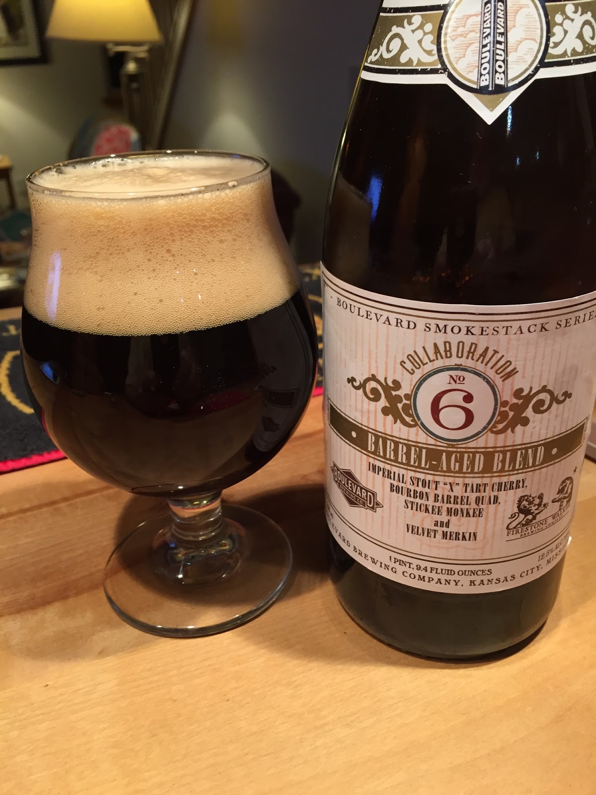 Boulevard Brewing's & Firestone-Walker Brewing's Collaboration #6: A blend of several beers from each of the two collaborators, the beer poured a deep, semi-translucent ruby color, with a nice, cream-colored head. The nose had notes of tart cherry and bourbon. Carbonation was good and the mouthfeel was medium to heavy. The flavor profile was rich and complex, with the various beers contributing elements ranging from tart cherries to oak. A very nice and enjoyable brew. 12.5% ABV.