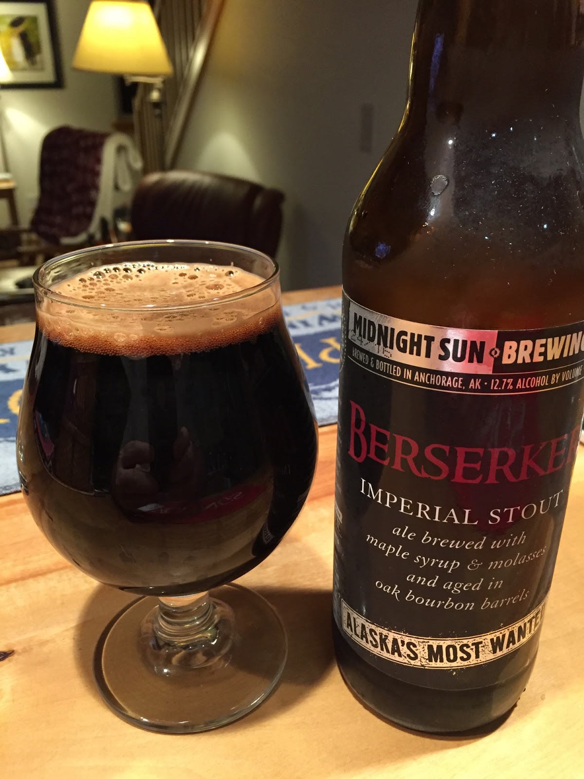Midnight Sun Brewing's Berserker Imperial Stout, 2016 vintage: Just released on Halloween, this is the return of a personal favorite. This year's version poured opaque with a tan head that dissipated to a collar. The nose had notes of bourbon, oak, and roasted coffee. Carbonation was good and the mouthfeel was heavy and luscious. As usual, the flavor profile was rich and complex, with elements of chocolate, coffee, bourbon, and oak taking turns in dancing across my palate. The strength of the beer makes itself felt in some warmth on the finish. Perfect for drinking now, or lay down as many bottle as you can afford for a couple of years in your beer cellar. 12.7% ABV, 30 IBUs.