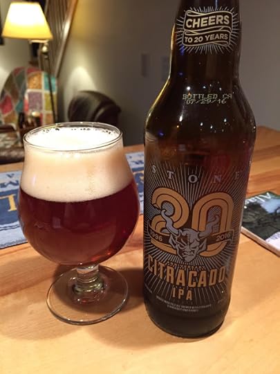 Stone Brewing's 20th Anniversary Citracado IPA: This beer was bottled on 7/29/2016. It poured a deep, clear copper color, with a big, off-white head. The nose was full of Citra hop notes. The carbonation was good and the mouthfeel was light. Up front, there was good bitterness, followed by lots of hop flavor and aroma. The use of avocado flower honey lightens the body, while still giving it a hefty 9% ABV. Not fantastic, but a good, solid entry into the ever-growing ranks of imperial IPAs...