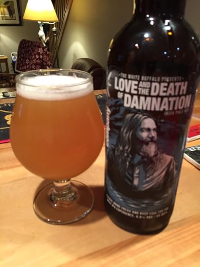 Anchorage Brewing's Loveand the Death of Damnation IPA: It poured a cloudy hazy orange-gold color, with a nice white head that left good lace. The aroma was full of bright, citrusy American hops. Carbonation was good and the mouthfeel was light. The initial bitter attack was good but not overwhelming, followed by lots of American hop flavor and aroma. A fine entry into the popular "hazy" sub-style of IPAs. 6.5% ABV, 60 IBUs.