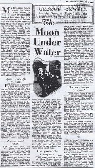 On February 9, 1946, an essay by the great George Orwell, entitled “The Moon Under Water,” was published in the Evening Standard of London. Orwell is better known today for his classic dystopian novel 1984 , but he was also an accomplished essayist, and this particular essay provided a detailed description of his favorite London pub, named The Moon Under Water. Every beer drinker should read this essay, so if for some reason you haven't yet dones so, take five minutes, click on the link above, and read it. Trust me, it's worth the short amount of time it will take. For those of you familiar with the essay, you will recall that the twist at the essay’s end is Orwell's admission that The Moon Under Water doesn’t actually exist; it represents his idealized version of the public house. In the spirit of Orwell, let’s consider the following thought experiment: If The Moon Under Water, the perfect pub, ever held the perfect beer festival, what would it be like?