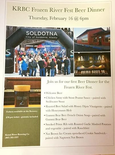 Finally, we are only three weeks away from the Frozen River Fest here in Soldotna, so it's time to start making your plans. In advance of the Fest this year there will be not one but two beer dinners. The Flats Bistro will be again be holding its dinner on Friday night before the Fest; check out my 2/26/2016 blog if you'd like to see just how fantastic last year's dinner was. In addition to The Flats' dinner on Friday, Kenai River Brewing will be hosting a dinner at the brewery on Thursday night. This is something Doug Hogue has wanted to be able to do for several years, so I fully expect it will be exceptional. Here's the poster for the Fest itself; keep an eye on its Facebook page for more details about the dinners.