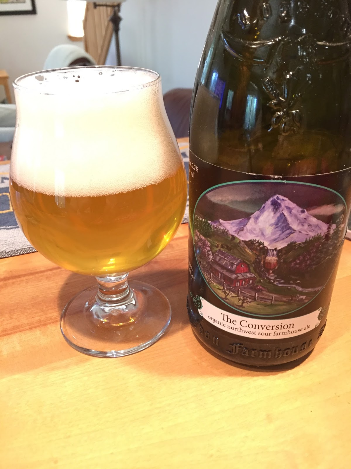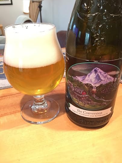 Logsdon Farmhouse Ale's The Conversion Sour Farmhouse Ale: It poured a clear gold with a big white head that left good lace. The aroma had a mixture of tart notes and some brett funkiness. Carbonation was excellent and the mouthfeel was light and effervescent. This continued onto the palate, where the beer was light and bright. There was a fine mixture of tartness and barnyard elements, falling away gradually to a long finish. A truly excellent sour. 7.7% ABV.