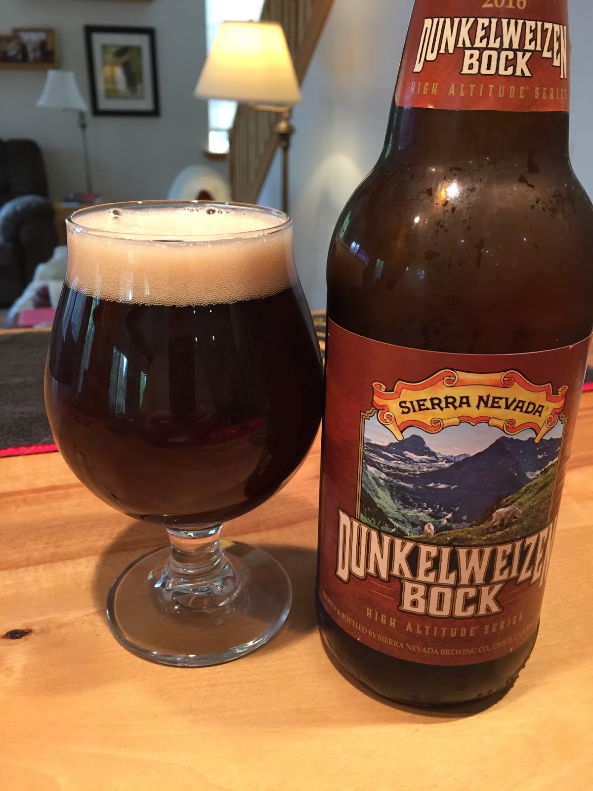 Sierra Nevada's Dunkelweizen Bock: It poured opaque with a small, cream-colored head. The aroma was of roasted malt and chocolate. The mouthfeel was good and so was the carbonation. The flavor profile was slightly sweet, with lots of rich, deep flavors of roasted malts, falling away to a long finish. It reminded me of a nice dessert, rich and satisfying. 7.2% ABV