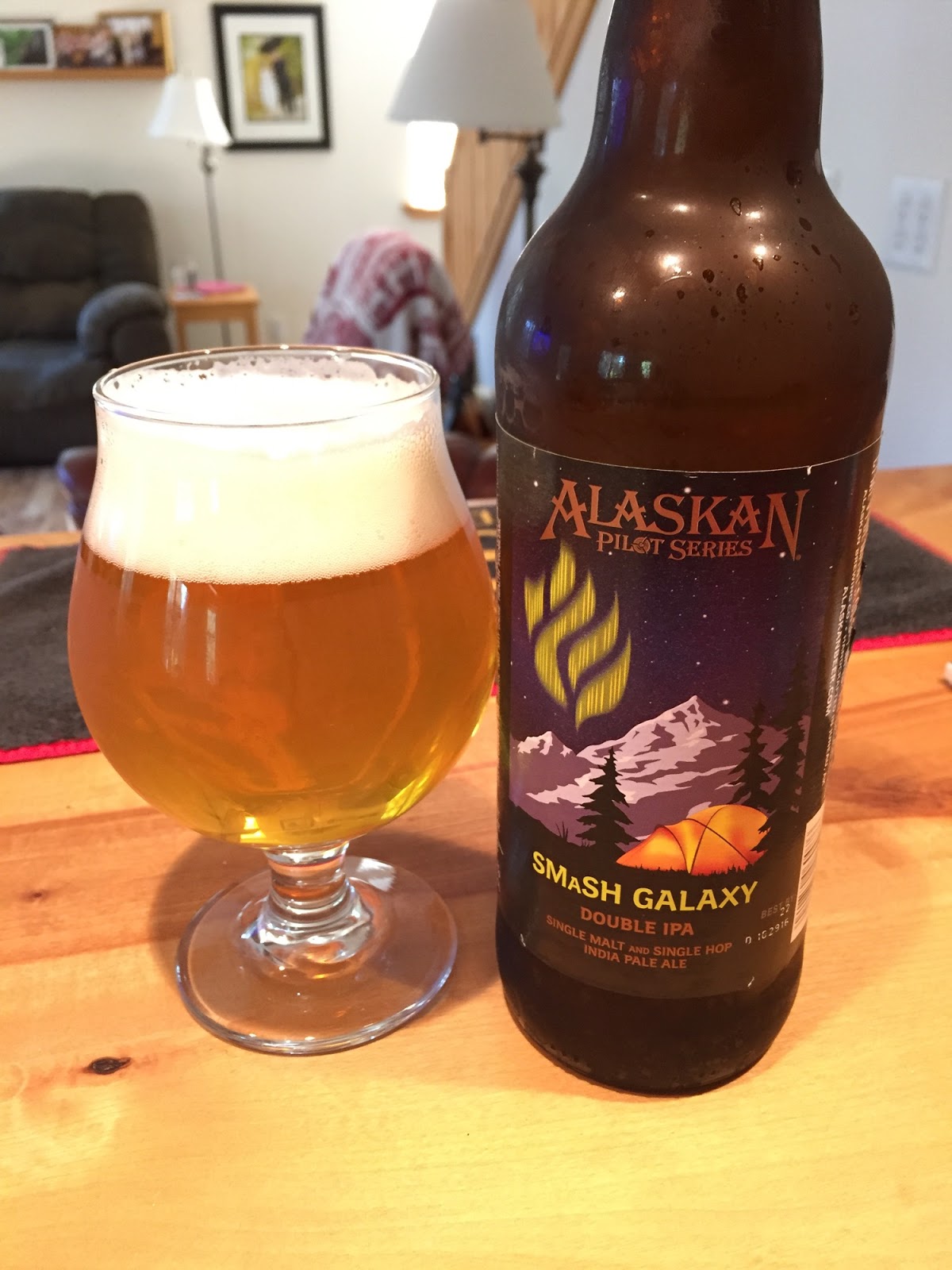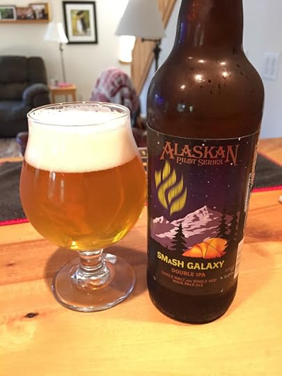 Alaskan Brewing's Smash Galaxy Double IPA: This beer is brewed using a single kind of malt and a single hop (SMSH or Smash). In this case, the beer showcases the Galaxy hop. It poured a clear gold with a big, white head that left good lace on the glass. The aroma was full of tropical fruit notes from the Galaxy hops. Carbonation was good and the mouthfeel as light. The initial bitter attack was good but not overwhelming, followed by plenty of clean Galaxy hop flavor and aroma. Overall, a very nice beer and one that does a great job showing off the characteristics of this popular hop variety. 8.5% ABV.