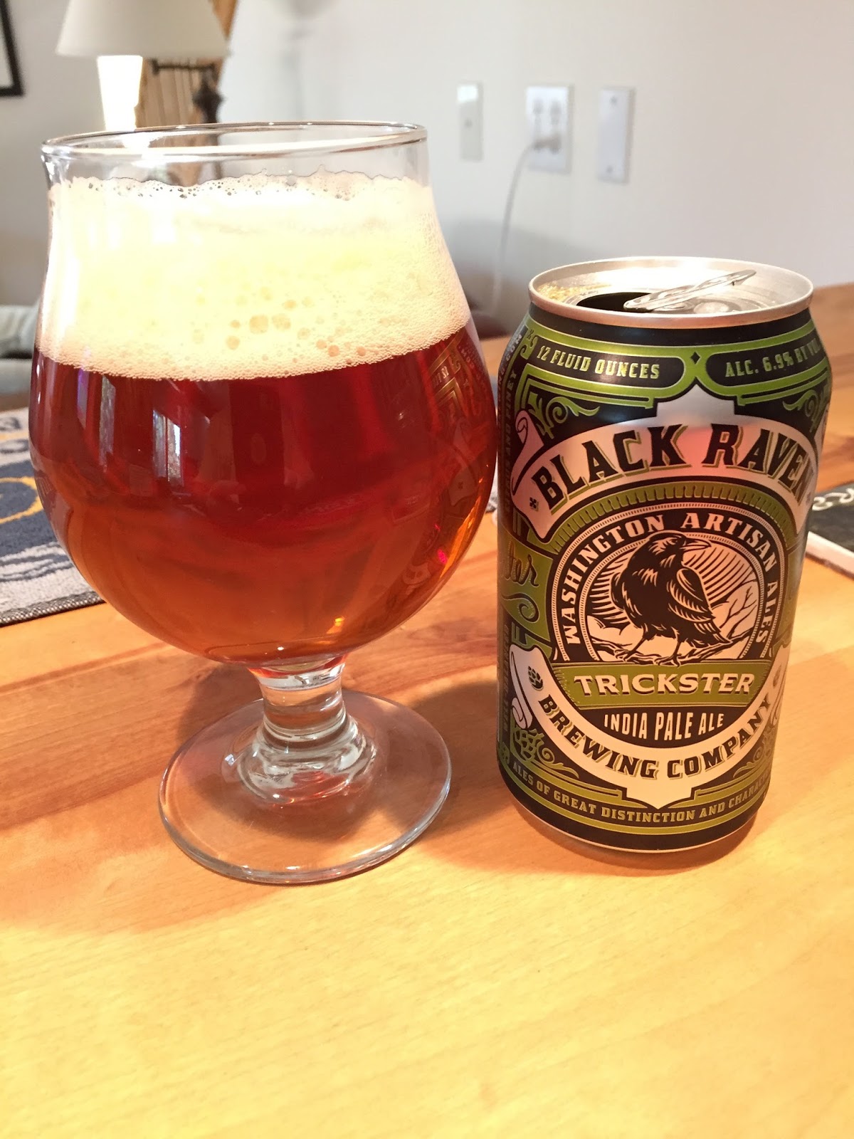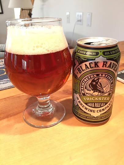 Black Raven Brewing's Trickster IPA: It poured a clear copper color with a nice, cream-colored head that left goo lace on the glass. The aroma had plenty of crisp American hop notes. Carbonation and mouthfeel were both good. There was plenty of bitterness in the initial attack, followed by lots of hop flavors and just a hint of toffee. A very enjoyable IPA. 6.9% ABV, 70 IBUs.